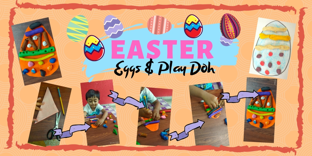 In this activity a coloured sheet of paper is cut in the shape of an egg and will be given to the kids. Now the kids are required to decorate these eggs with different colored PlayDohs as they wish.They can roll the PlayDohs and make cylindrical strings out of it. Now thesestrings can be used to decorate the egg in many many different ways as per the child’s wish. Or he/she can make some doh balls and decorate their eggs with them.